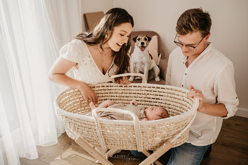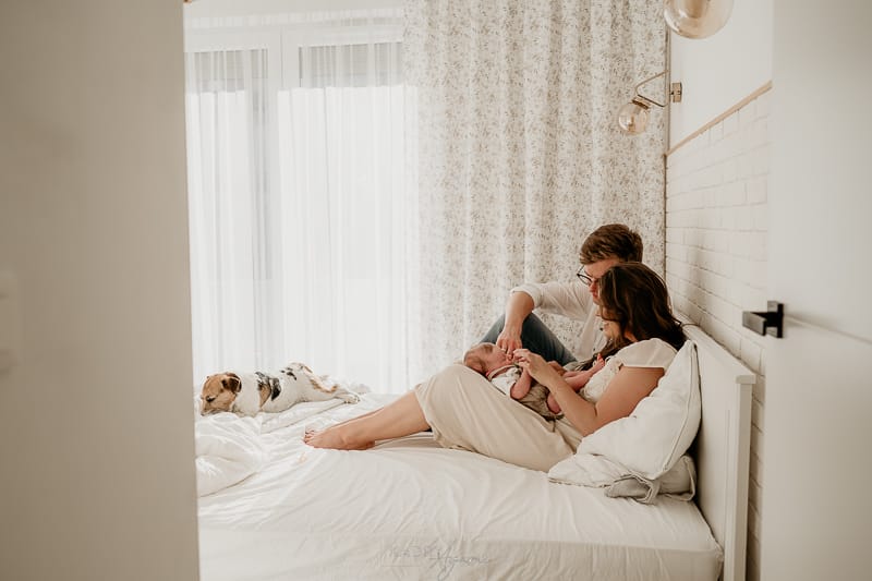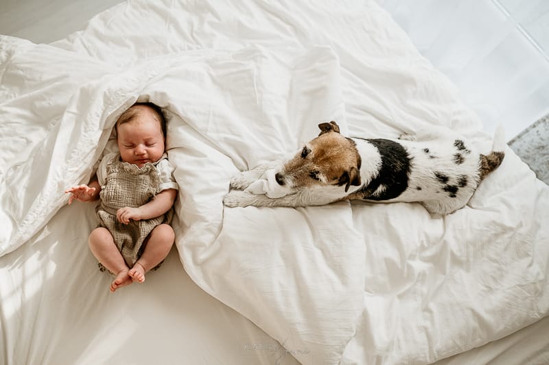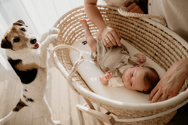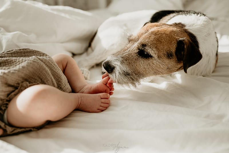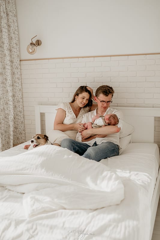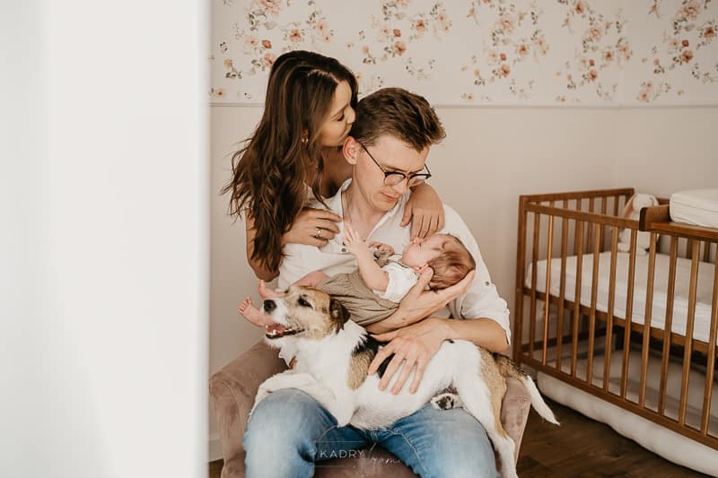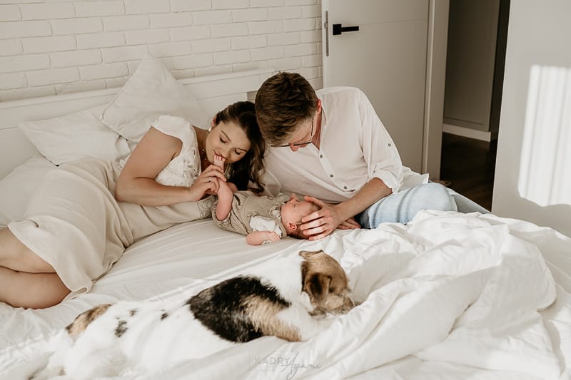 Podczas sesji u Karoliny, obecny był również przeuroczy Jack Russell Terrier, który pilnował najmłodszego członka rodziny w trakcie sesji noworodkowej:) Jakie są jeszcze zalety naturalnej sesji noworodkowej w domu przeczytasz tutaj